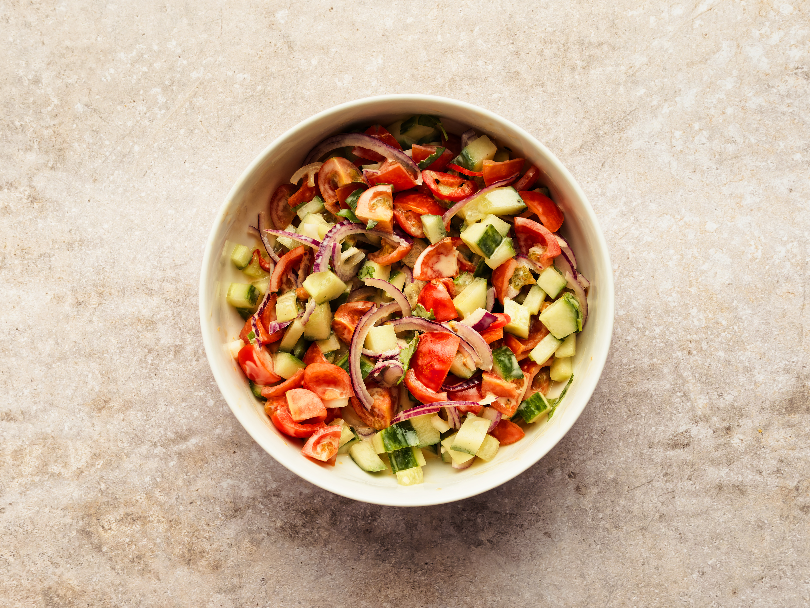 Heerlijk frisse salade die bij heel veel verschillende gerechten past. Maar stiekem is hij het lekkerst bij (vegan) shoarma.